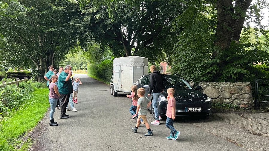 Thomas' neuer Tesla-Firmenwagen wurde direkt getestet, im Anhänger sind die Schafe sicher und wohlbehalten von hinter Hamburg bis nach Ostfriesland elektronisch transportiert worden.