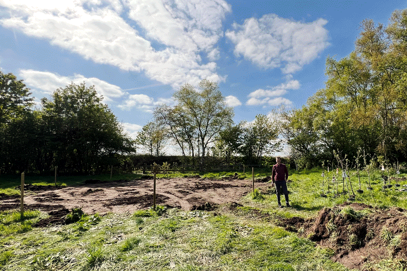 Thomas' Idee malt einen Kreis von Bäumen in dessen Fläche eine Blühwiese erstrahlt. Es hat ein paar Wochen gedauert und nun endlich ist alles bunt! Sogar die Bäume tragen grüne Trachten, denn der Hase lauert nach frischer Rinde und kleinen Obstbaumblättchen...ohje!