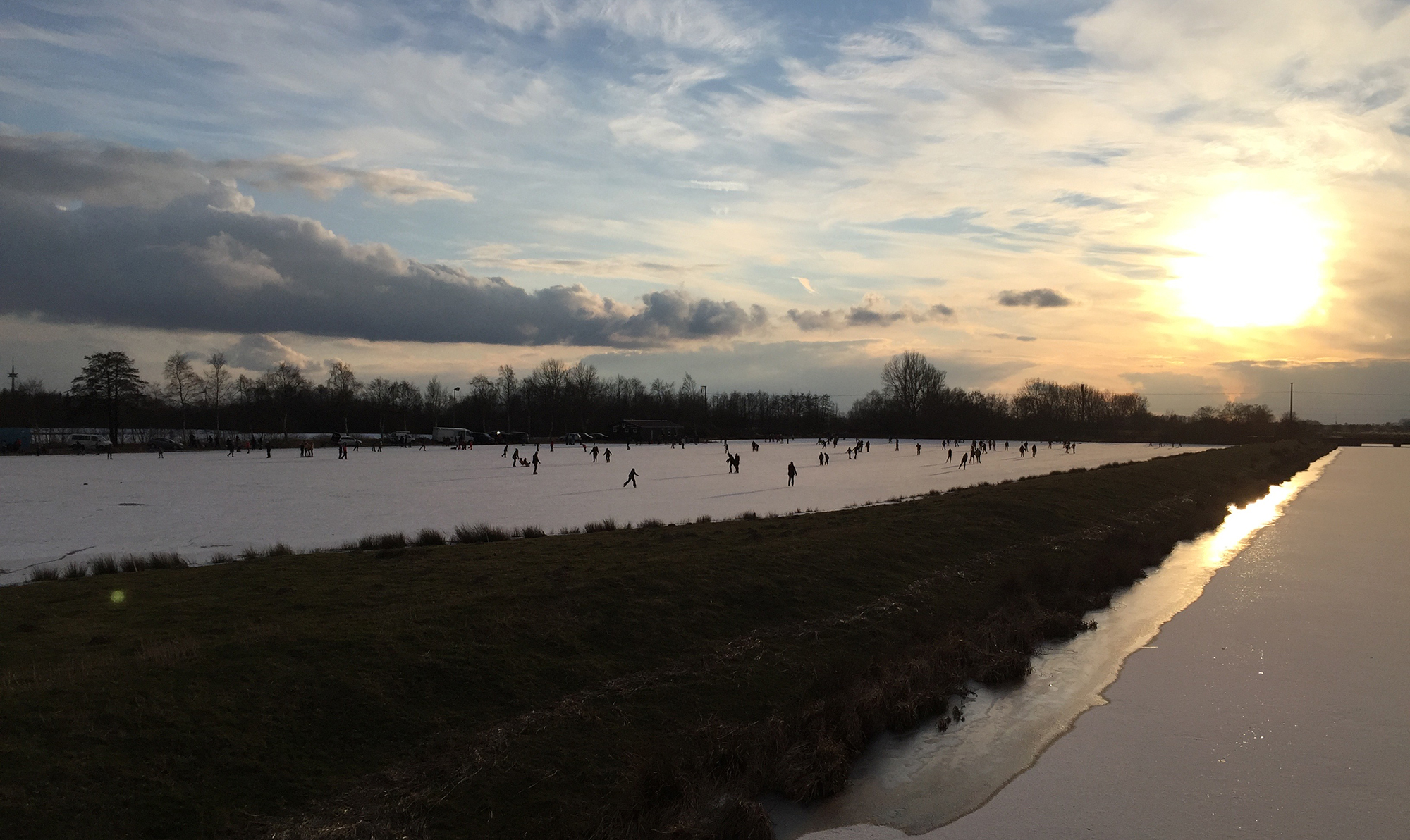 Im Winter wird Grünland über den Sauteler Kanal mit Emswasser überspühlt. Dadurch entsteht schon nach ein, zwei Frostnächten eine herrlich riesige Eisfläche zum Schlittschuhlaufen!