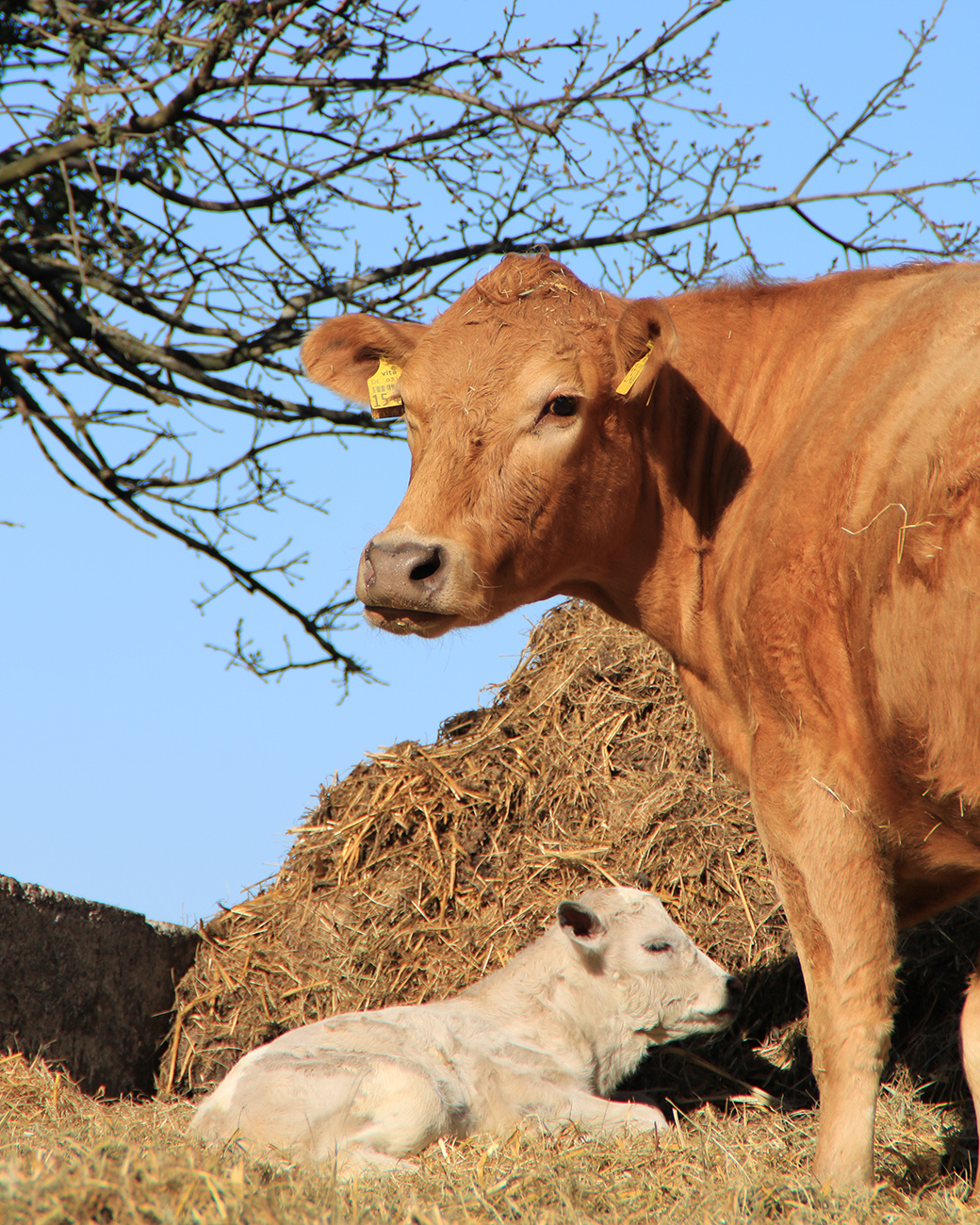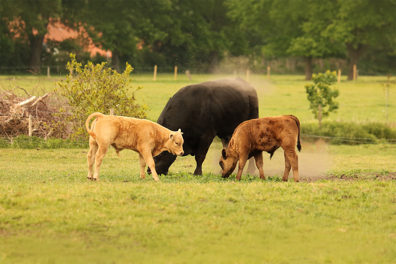 Unser Bulle "Petrus" und unsere Kühe "Pauline", "Yellow", "Möhre", uvm. können bei uns ganzjährig in den Stall und auf die Weide. Die kleinen Kälbchen laufen mit in der Herde und trinken bei Mama. Unsere Kühe sind extrem zahm und können problemlos gestreichelt und liebkost werden. Schon viele Gäste konnten bei einer Geburt zusehen - ein wirklich immer wieder sehr eindrucksvolles Erlebnis!