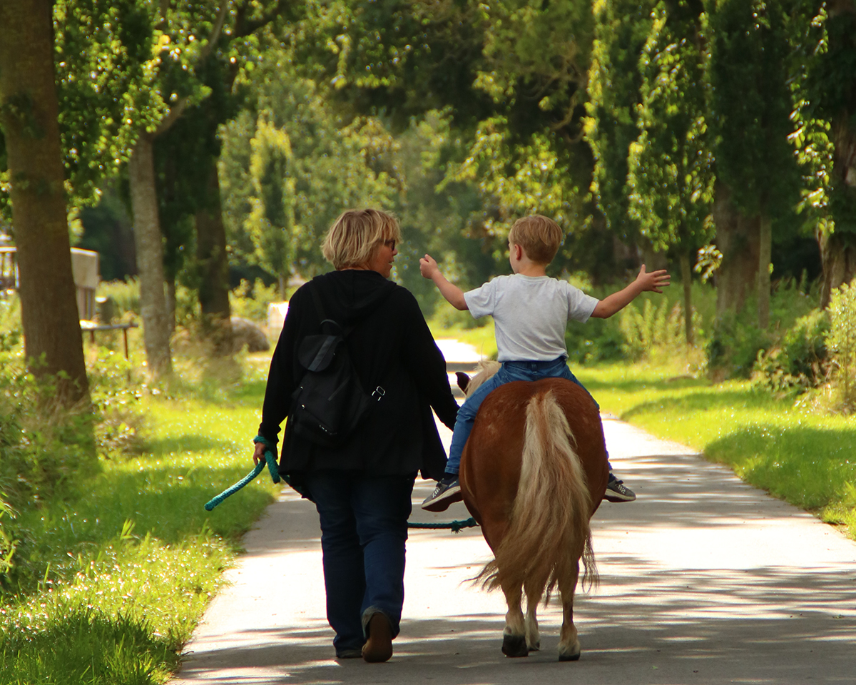 Während Biggi (hier rechts im Bild) auch gerne etwas stürmischer unterwegs ist, trottet die gemütliche Schecke Lissi auch gerne den allerkleinsten hinterher, wenn noch etwas zaghaft geführt wird.